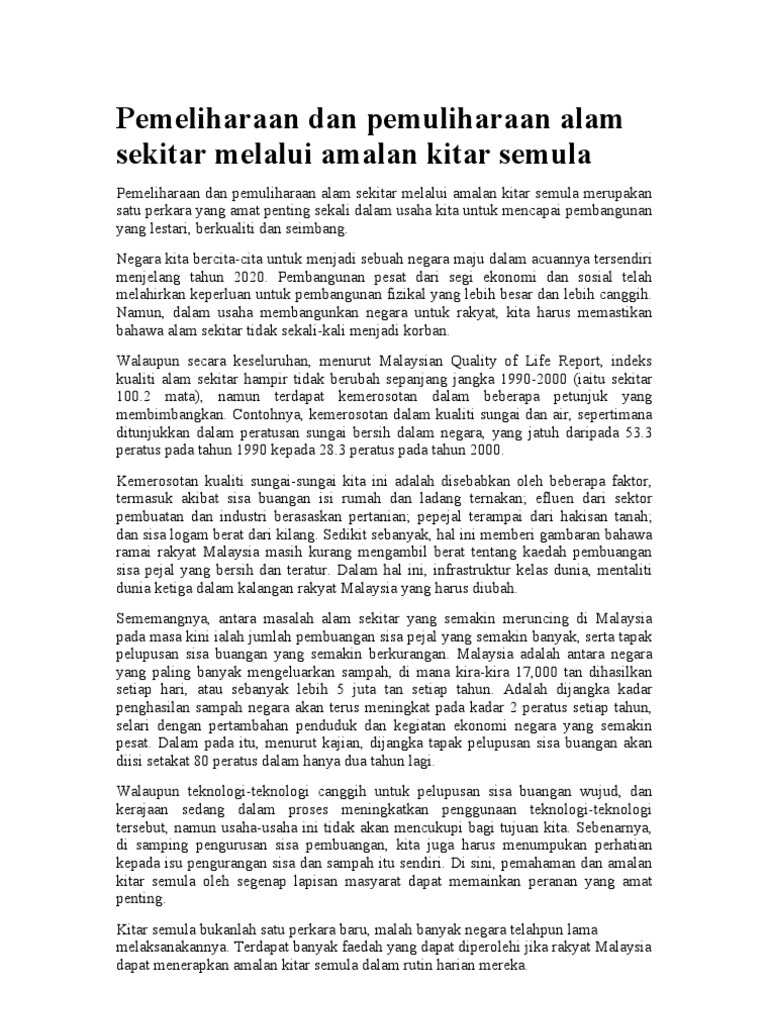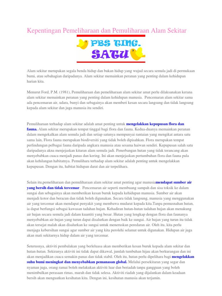 Penilaian impak alam sekitar(eia) penilaian impak alam sekitar merupakan satu pendekatan yang menekankan aspek pengurusan alam sekitar secara menyeluruh bagi mengekalkan keseimbangan antara pembangunan. Pemeliharaan dan pemuliharaan alam sekitar. .alam sekitar.serentak dengan ini akta ini perlu diperketatkan agar usaha memelihara dan dengan kualiti alam sekitar dibawah aspek pengekalan, pemeliharaan, dan pemuliharaan alam sekitar. 0 ratings0% found this document useful (0 votes). Apakah maksud pemeliharaan dan pemuliharaan ?