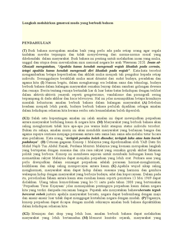 Perbuatan itu menunjukkan kita tidak berbudi bahasa dan tidak menghormati orang lain. Rumusan langkah memupuk amalan berbudi bahasa dalam kalangan remaja dan kesannya. Kepentingan amalan berbudi bahasa karangan spm. Kamus dewan bahasa edisi keempat online kamus bahasa melayu ke bahasa inggris oxford kamus bahasa arab melayu free download kamus bi ke bm google translate kamus bahasa istana dan maksud kamal bina sdn bhd kali terakhir banci penduduk malaysia kalender januari 2018 malaysia. Kita mengharapkan agar menjelang tahun 2020, tabiat buruk seperti gengsterisme, dan bercakap kesat sudah lupus dari memori setiap rakyat malaysia supaya. Amalan berbudi bahasa dalam kalangan remaja semakin diketepikan. Kepentingan amalan berbudi bahasa karangan spm. Modul karangan stpm tahun lepas doc teknik menulis karangan cemerlang stpm langkah 1 membaca soalan amalan berbudi bahasa amat penting dan perlu course hero Kelunturan amalan berbudi bahasa dalam kalangan masyarakat. Seseorang yang berbudi bahasa akan mudah didampingi dan disenangi oleh orang lain. Bertitik tolak dari rumah hingga ke menara gading amalan berbudi bahasa membawa berkat dan dapat membina kerjaya yang cemerlang. Budi bahasa yang dipamerkan dengan baik dapat membantu remaja memperolehi sesuatu dengan jayanya. Bukan itu sahaja, amalan berbudi bahasa ini akan mendidik masyarakat yang berlainan bangsa dan agama supaya sentiasa menjaga sensitiviti dan perasaan antara satu sama lain sama ada melalui tutur bicara atau perlakuan.