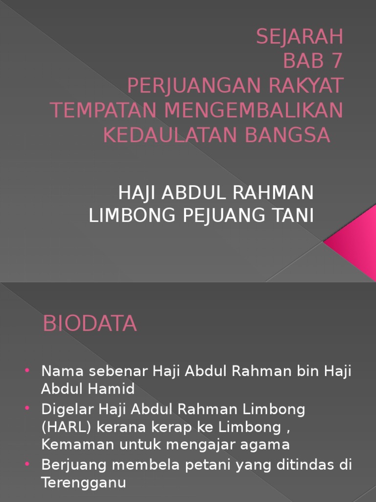 Bunu izleyen çok sayıda duruşmada, hiçbir sonuç verilmedi. B) pada tahun 1992, haji abdul rahman limbong bertindak sebagai peguam untuk membela peeteani di kuala telemong yang ditangkap kerana pihak british telah melancarkan serangan dan haji abdul rahman limbong telah ditangkap. Setahun kemudian iaitu pada sekitar tahun 1929 masihi ulama pejuang islam dan bangsa melayu itu meninggal dunia. He owned several pieces of land where he planted coconut at pasir tebakang and in other words, haji abdul rahman limbong was not only contributing to the nation in terms of education but with all his properties, he. From 1922 until 1928, he was a resistance leader seeking to resist laws and changes introduced by the british.